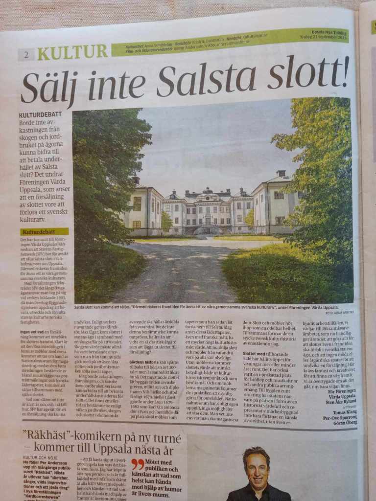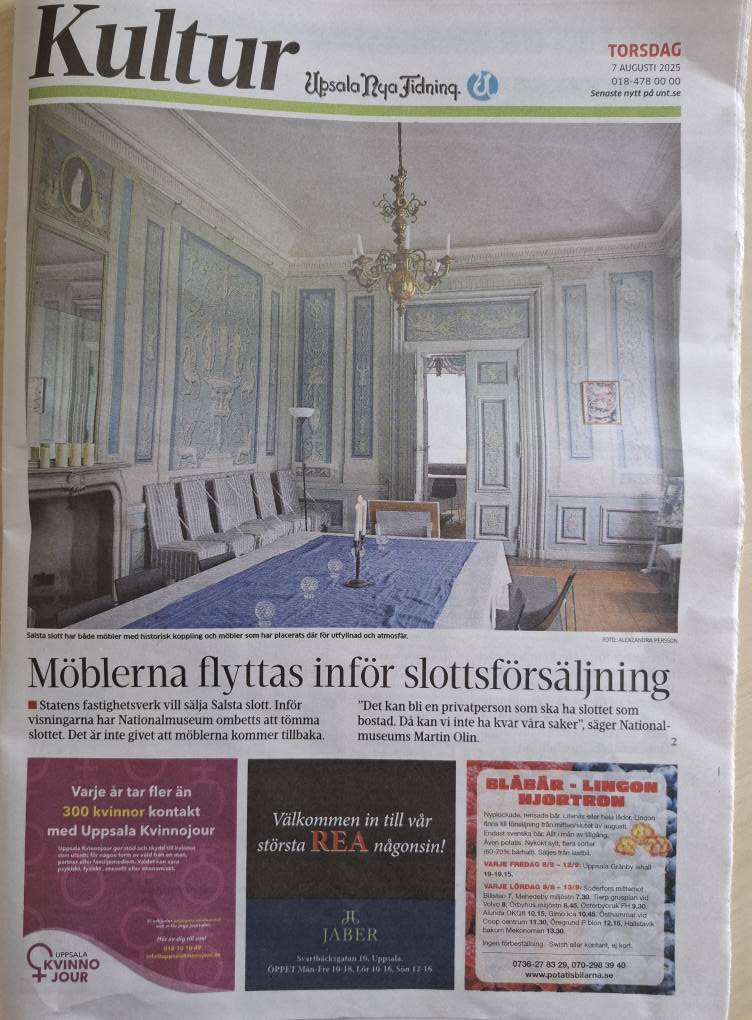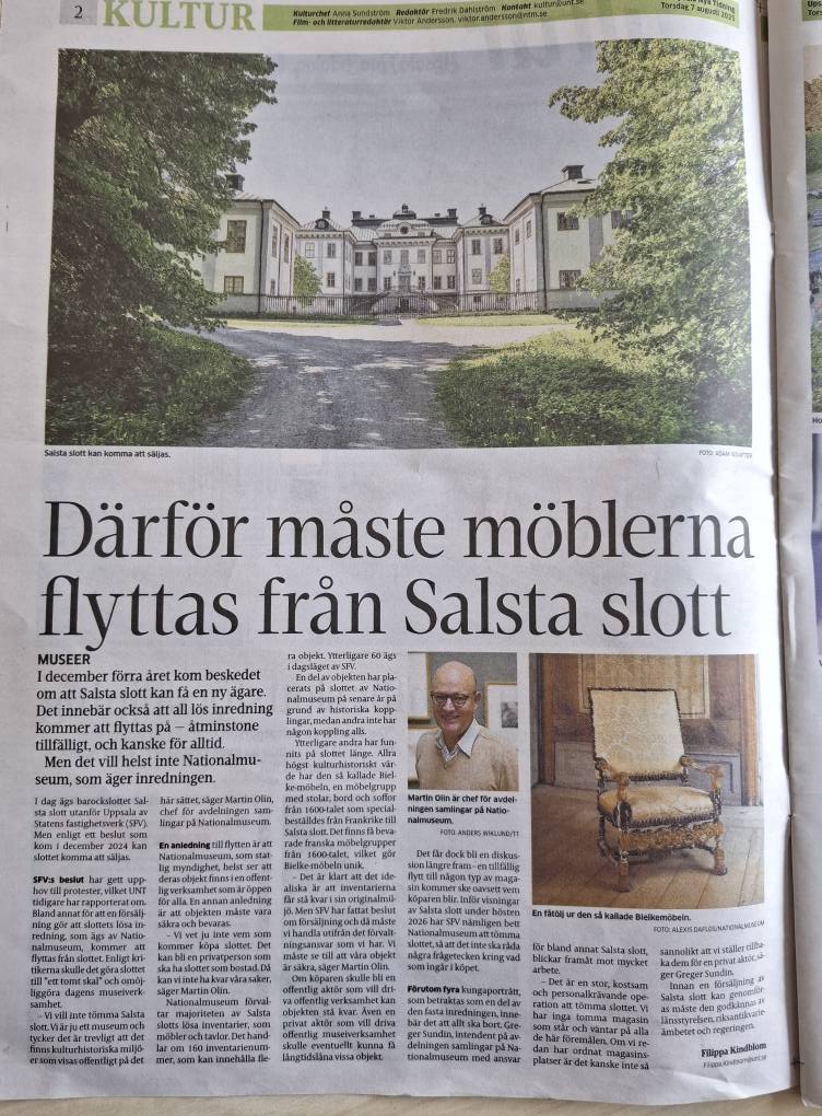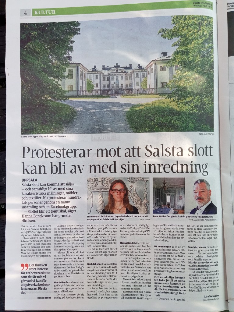Statens fastighetsverk (SFV) har i december 2024 meddelat att man vill utreda en försäljning av Salsta slott. Detta skulle innebära att Nationalmuseum, som äger de lösa inventarierna behöver montera ned och magasinera dessa, då de inte kan förvara sina föremål i privat ägda fastigheter. Detta skulle i sin tur vara, anser jag och många andra, ett stort kulturbarbari eftersom det rör sig om autentiska inredningar och föremål, värdefulla kulturhistoriska konst- och konsthantverksprodukter som i många fall funnits på slottet sedan 1600-talet.
