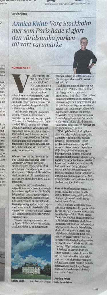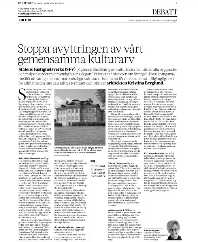 Artitekt Kristina Berglund skriver en debattartikel i Svenska Dagbladet 27 juli och en i Epoch Times 17 september 2025.