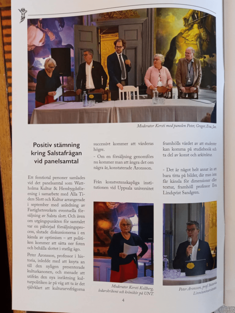 11 september anordnades ett panelsamtal på Salsta. Medverkande var Peter Aronsson, professor i historia och rektor vid Linnéuniversitetet, Eva Lindqvist Sandgren, professor i konstvetenskap vid Uppsala Universitet, Jan O M Karlsson, lektor i konstvetenskap vid Uppsala Universitet, och Greger Sundin, intendent vid Nationalmuseum. Moderator var Kersti Kollberg, tidigare ledarskribent och idag krönikor på Upsala Nya Tidning. Ett femtiotal personer satt i publiken, däribland representanter från bl a riksdagspolitiken, SFV och lokalsamhället. Samtalet spelades in och finns att lyssna på i efterhand via denna YouTube-länk (öppnar i ny flik).